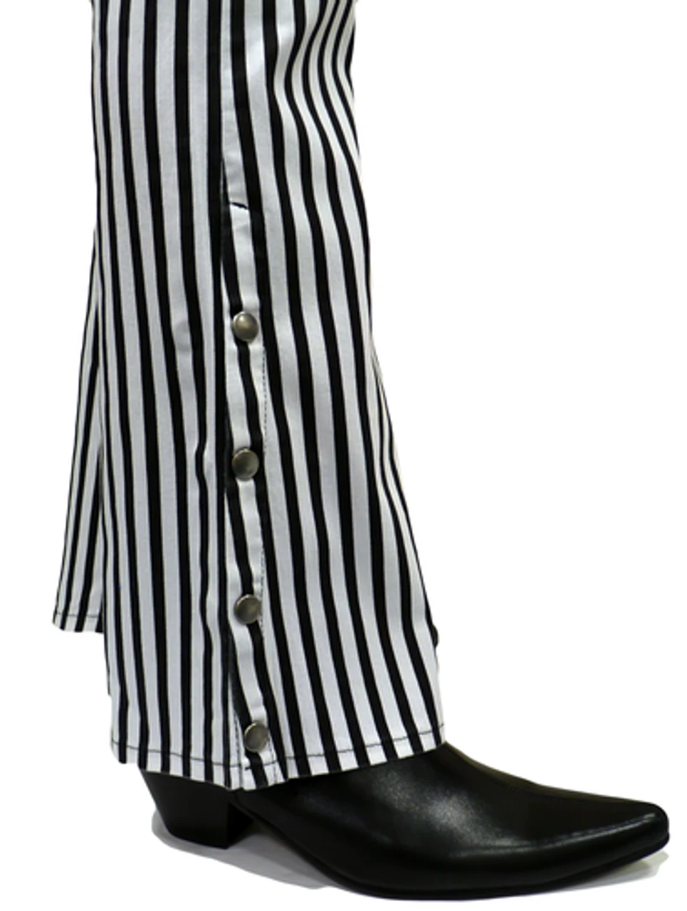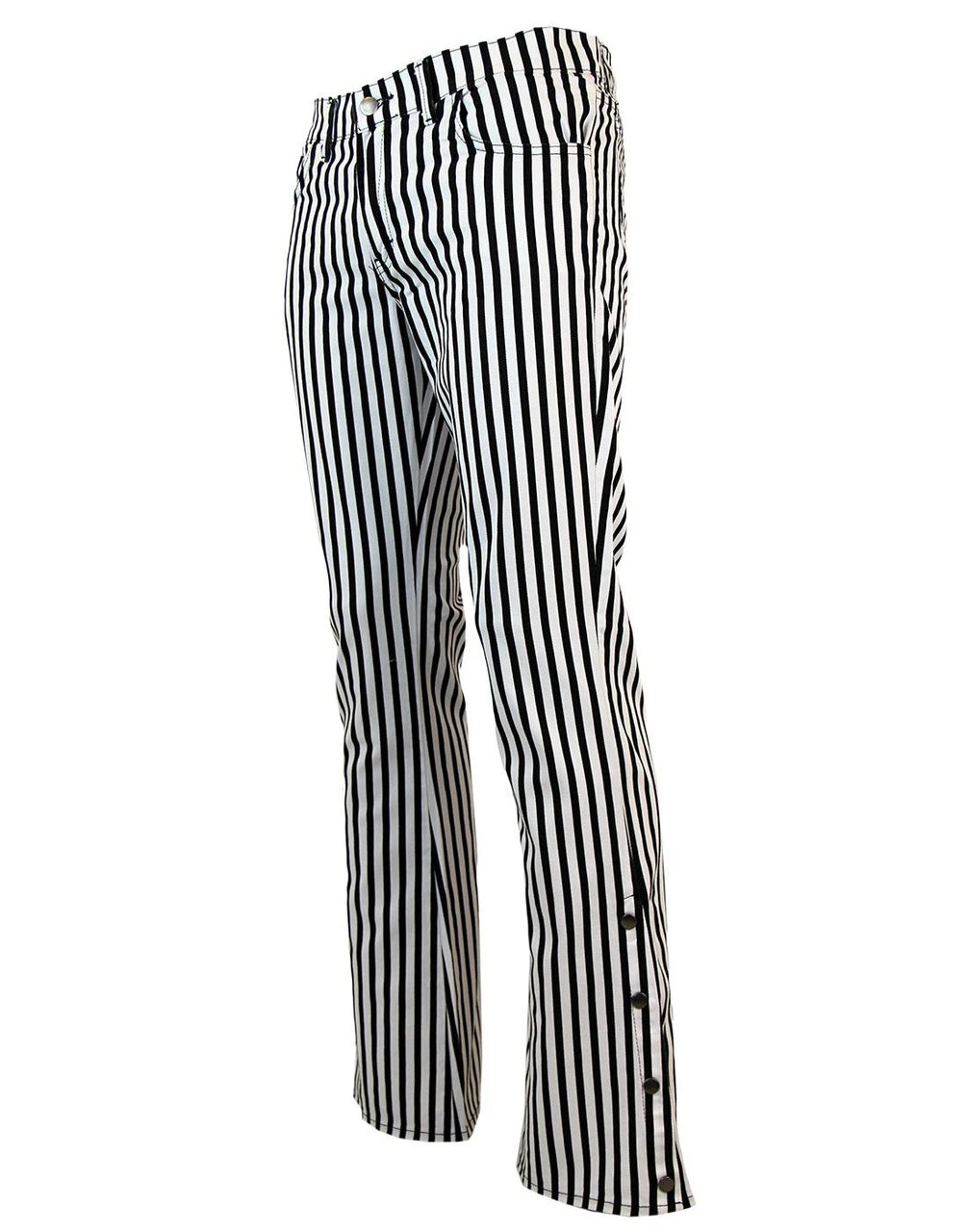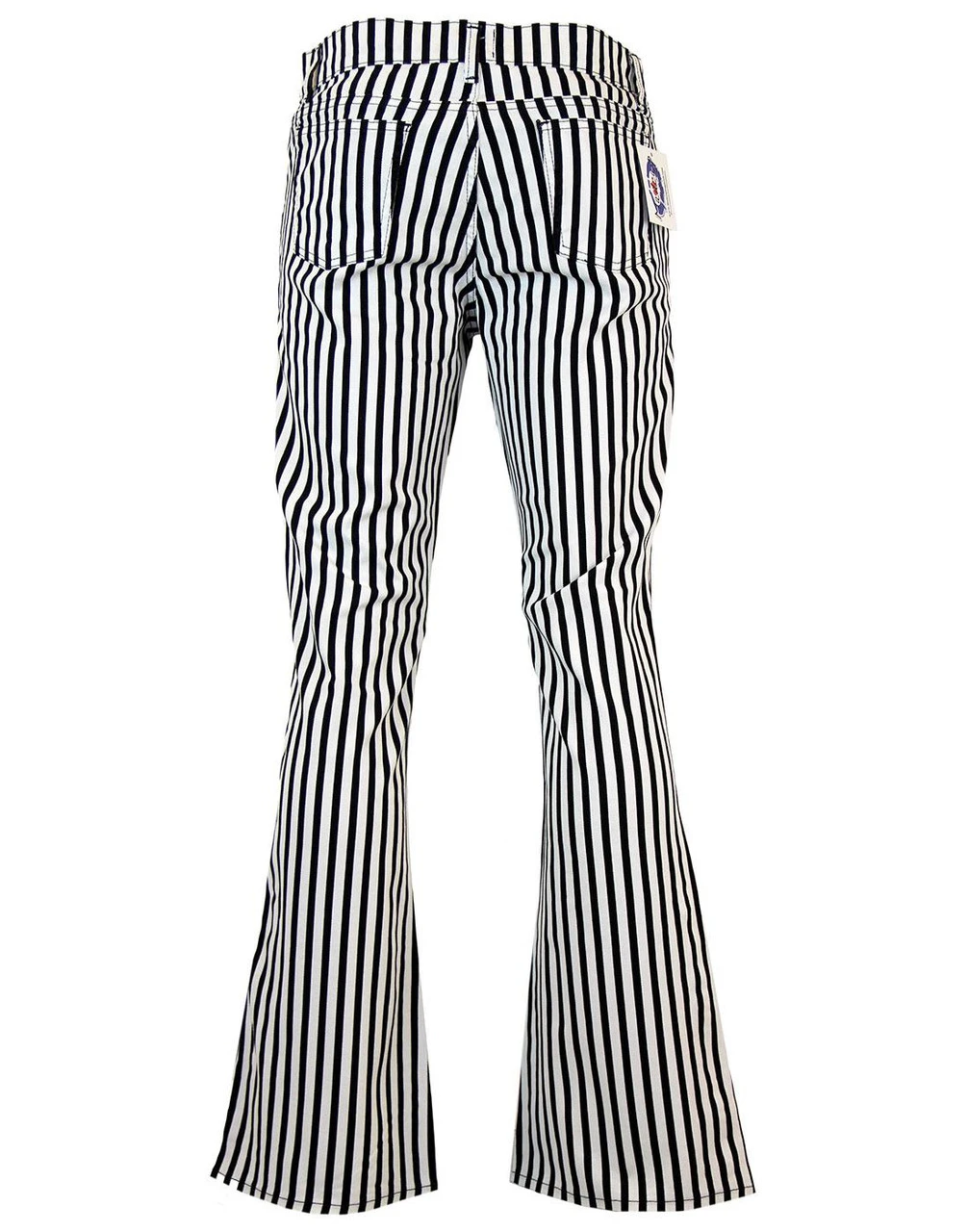 DUKE’ RETRO MENS STRIPED BOOT CUT FLARES BY MADCAP ENGLAND – Madcap England Mens Retro Sixties/Seventies style Black and White Striped Boot cut flares with press stud bottoms. Button waist. Zip fly. Low rise (hipster) waist. Pockets to front and reverse.