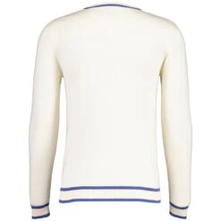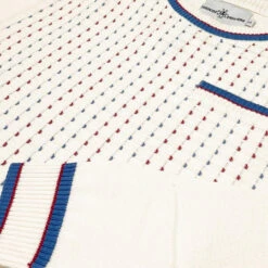 The Hawkins Jumper in snow white is an extension to our established Coltrane and Miles styles and features a stylish textured retro jacquard front panel that incorporates red and blue accents. The colour pop detailing weaves in and out of the raised snow white horizontal ribbed stripes to create an awesome vintage effect. The vibrancy is further enhanced by the retro tipped crew neck collar, faux pocket welt and cuffs. The Hawkins Mod Jacquard Knit Jumper works great as part of a smart-casual outfit. Pretty much perfect for any occasion!