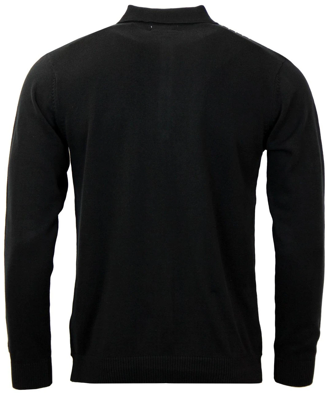 ‘PINSTRIPE MARRIOTT’ MENS RETRO SIXTIES MOD BUTTON THROUGH POLO CARDIGAN by MADCAP ENGLAND – Mens navy and maroon Retro panel Polo Cardigan with cool Indie pinstripe detail. Sixties Mod polo collar, full button through, ribbed hem and cuffs. Contrast white Retro brace stripes accentuate the garment and cleverly splits the two main block colours. Branded Madcap England buttons and tonal signature detail to cuff. ‘Pinstripe Marriott’ Mens Button Through Polo Cardigan by Madcap England.