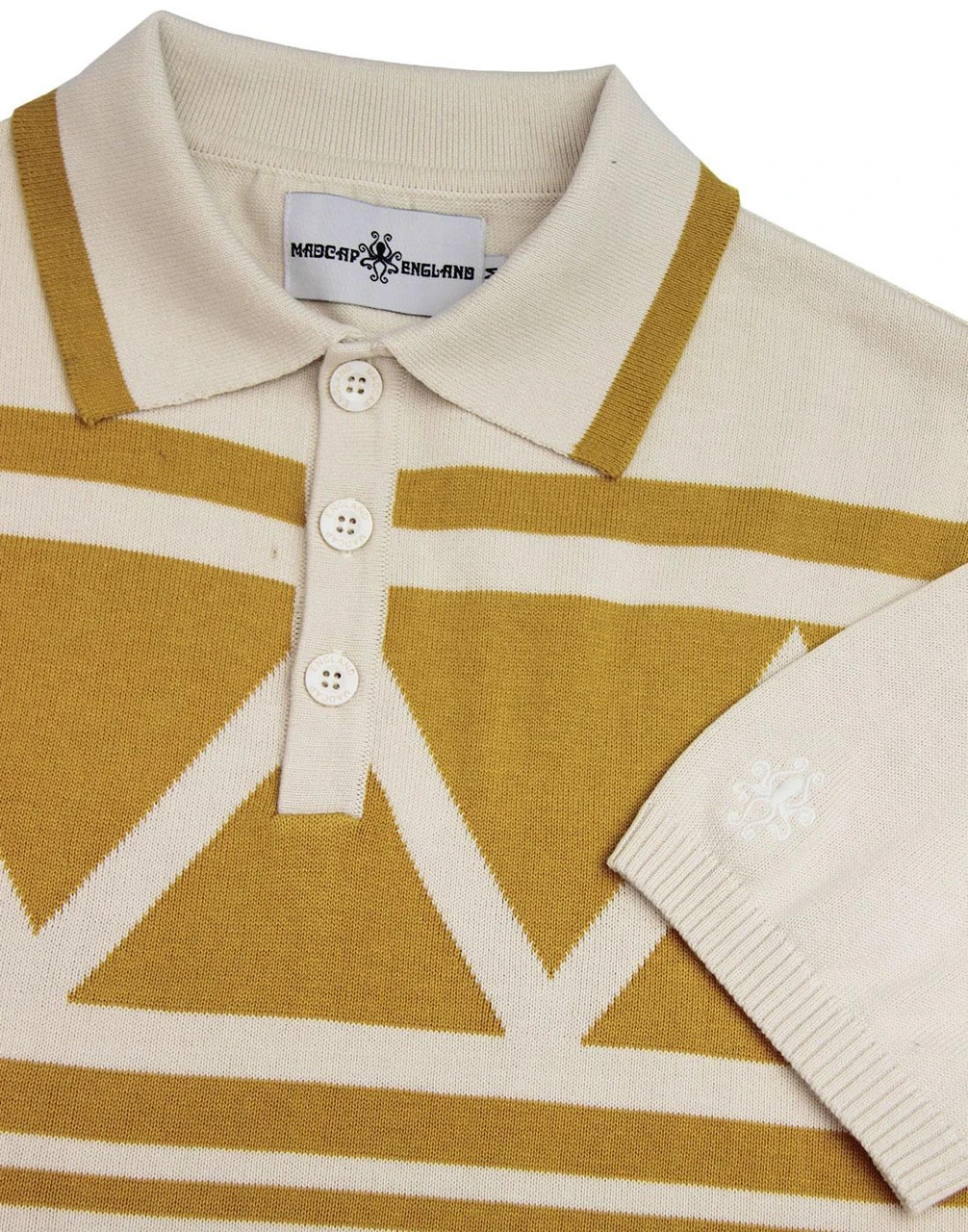 – Madcap England ‘Setting Sun’ men’s retro Aztec knit polo shirt.