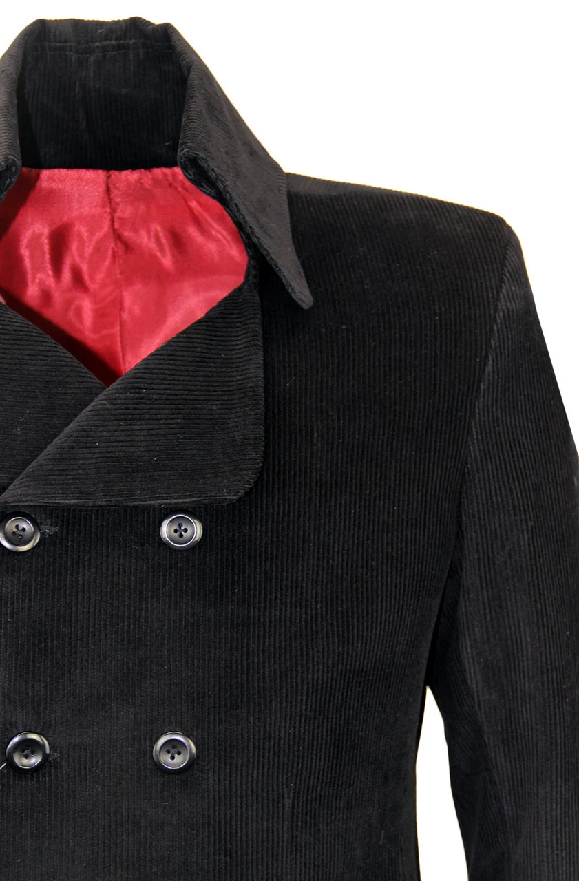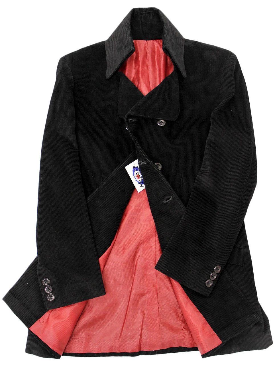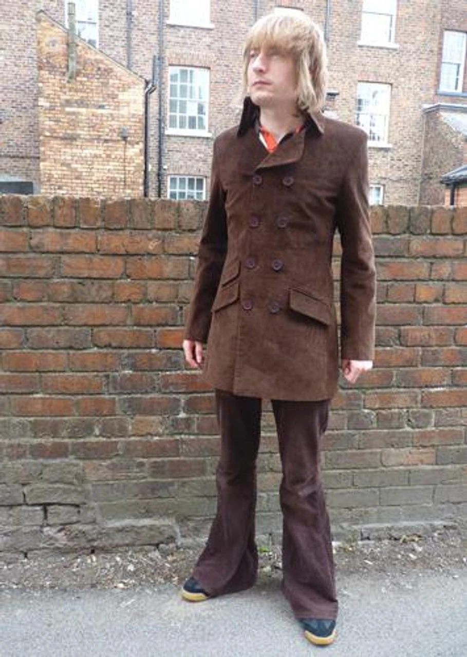 ‘THE IN CROWD’ MENS RETRO MOD SUIT JACKET by MADCAP ENGLAND – Based on the Original Design by Velvet Illusion’s Michael Wolf. Immaculate brown corduroy, double breasted, Brian Jones style Mens Dress jacket. Contrast lined, concealed inside pocket. Two flap pockets, right side ticket pocket, superb retro, mod rounded lapel detail with obligatory 60s/70s inspired stand up collar.