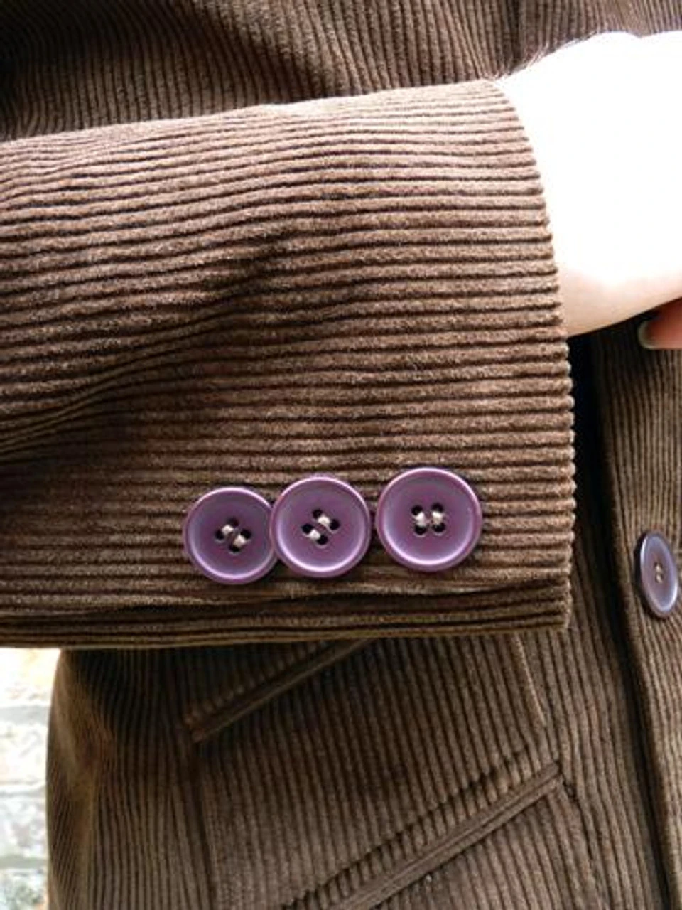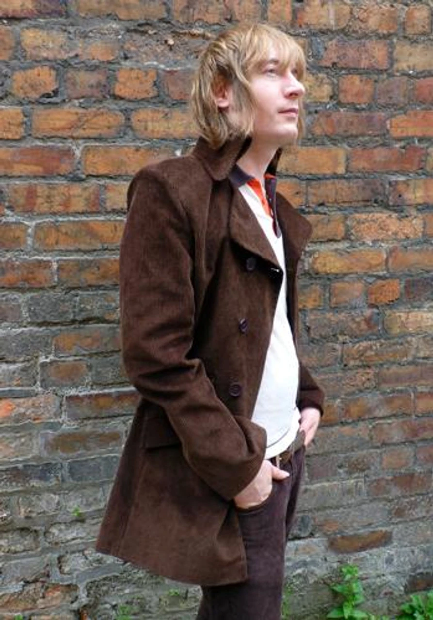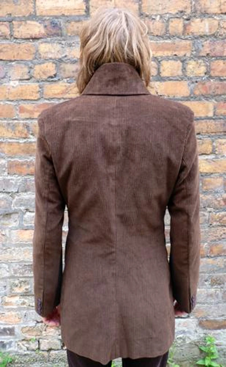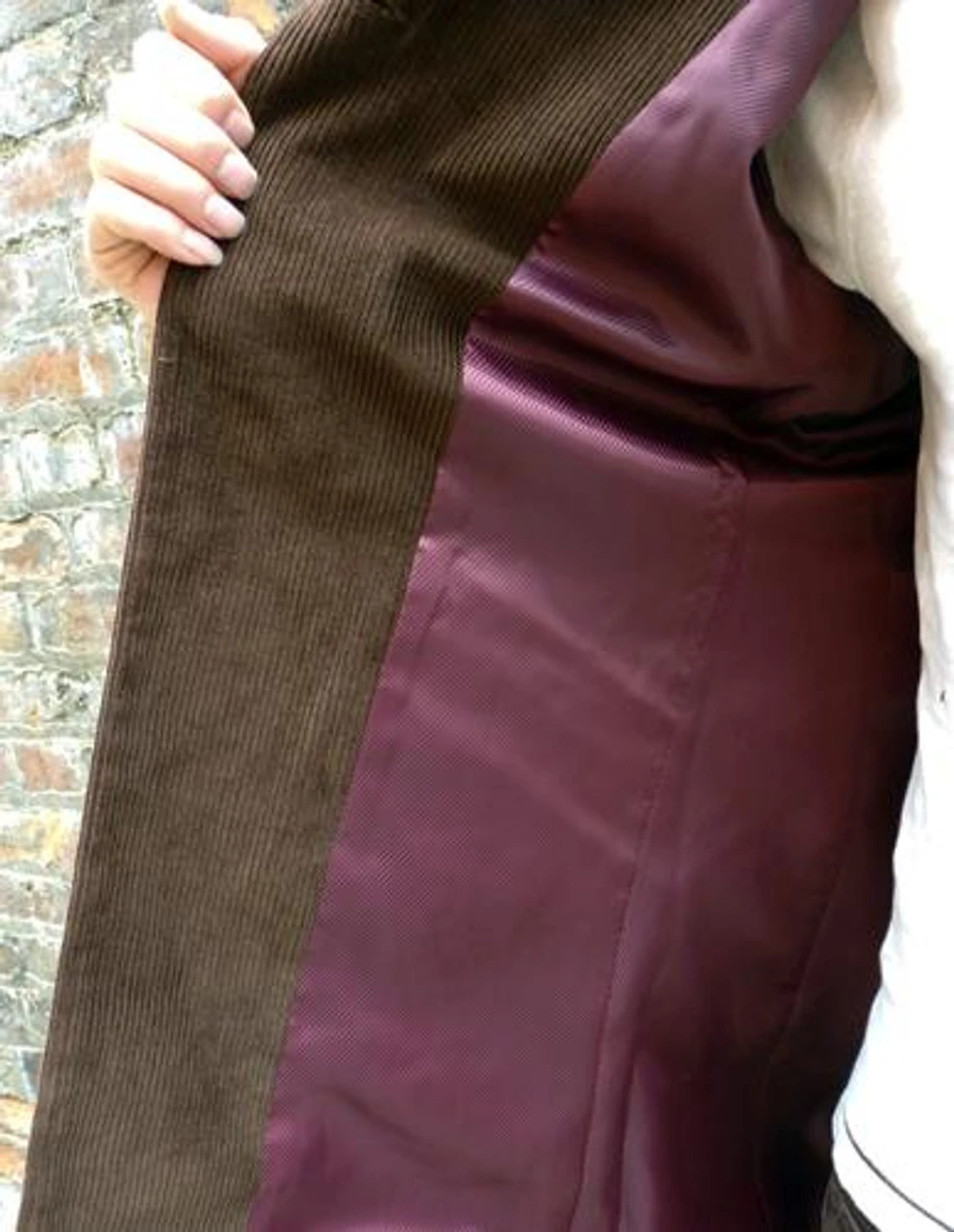 ‘THE IN CROWD’ MENS RETRO MOD SUIT JACKET by MADCAP ENGLAND – Based on the Original Design by Velvet Illusion’s Michael Wolf. Immaculate brown corduroy, double breasted, Brian Jones style Mens Dress jacket. Contrast lined, concealed inside pocket. Two flap pockets, right side ticket pocket, superb retro, mod rounded lapel detail with obligatory 60s/70s inspired stand up collar.